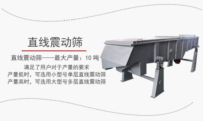 直線振動篩的多種型號選擇滿足了用戶對于產(chǎn)量的要求,產(chǎn)量低時,可選用小型號單層直線振動篩;產(chǎn)量高時,可選用大型號多層直線振動篩,其中直線振動篩可滿足時篩10噸左右!
