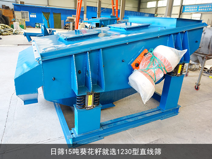 ps.除1230型直線篩外,大漢機械生產的1224型直線篩(2400mm寬x1200mm長)也可以滿足15噸葵花籽的篩分,但是相較于1230型的直線篩還是略遜一籌,但是價格要低500-3200元不等,所以預算成本不高的用戶,這款設備也是您不錯的選擇~