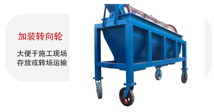 設(shè)備的整體性較高加裝轉(zhuǎn)向輪,便于施工現(xiàn)場存放或轉(zhuǎn)場運輸,可拆卸的部件只有成品堆料皮帶機,松開底部固定螺栓和吊掛鋼絲繩,將成品皮帶機塞入主框架底面即可。