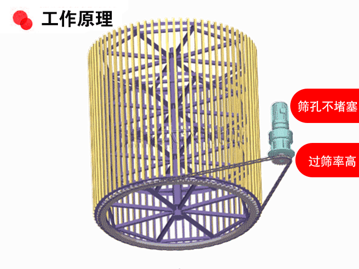 該產品的主要依靠驅動裝置帶動滾筒篩網,對于物料做360°旋轉時篩分,在滾動篩網的作用下,物料能夠輕松的達到分散的狀態,從幫助篩網進行快速的篩分。通過篩網網孔的物料留到皮帶輸送機上,由出料口排出,而沒有通過篩網篩分的將從肥料口排出,從而完成物料的篩分目的。
