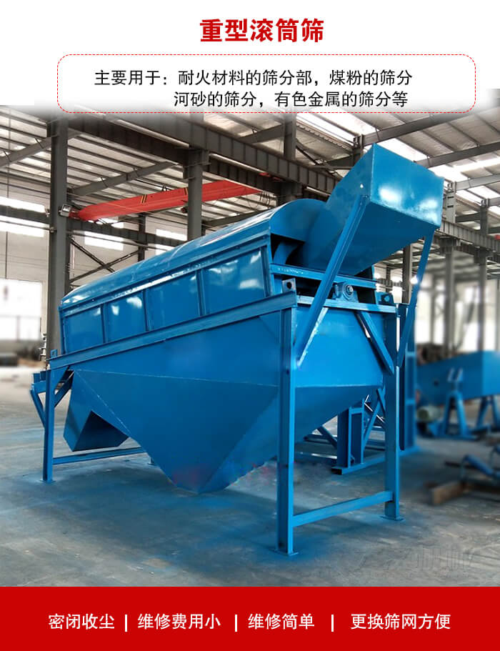 重型滾筒篩主要用于:耐火材料的篩分部,煤粉的篩分,河砂的篩分,有色金屬的篩分等。具有密閉收塵,維修費用小,維修簡單,更換篩網方便等特點根據不同用戶的篩分需求選擇:單層滾筒篩:主要分離出兩種粒度的物料。多層滾筒篩以及單層多段滾筒篩:可分離多種粒度的物料。
