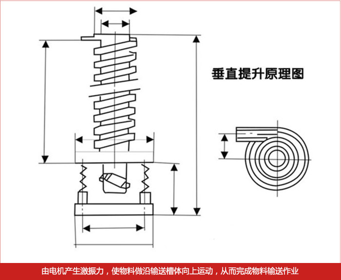 螺旋垂直振動提升機DZC系列垂直振動輸送機的驅動裝置振動電機安裝在輸送塔下部,兩臺振動電機對稱交叉安裝,輸送塔由管體和焊接在管體周圍的螺旋輸送槽組成,輸送塔座于減振裝置上,減振裝置由底座和隔振彈簧組成。當垂直輸送機工作時,根據雙振動電機自同步原理,由振動電機產生激振力,強迫整個輸送塔體作水平圓運動和向上垂直運動的空間復合振動,螺旋槽內的物料則受輸送槽的作用,作勻速拋擲圓運動,沿輸送槽體向上運動,從而完成物料的向上(或向下)輸送作業。