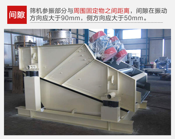 篩機各部分連接必須牢固可靠,所有螺栓不得有松動。篩機上參振部分與周圍固定物之間的間隙在振動方向應大于90mm,在側方向應大于50mm.
